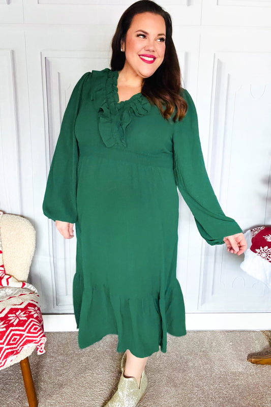 Beautiful You Holiday Green Overlap Ruffle V Neck Midi Dress