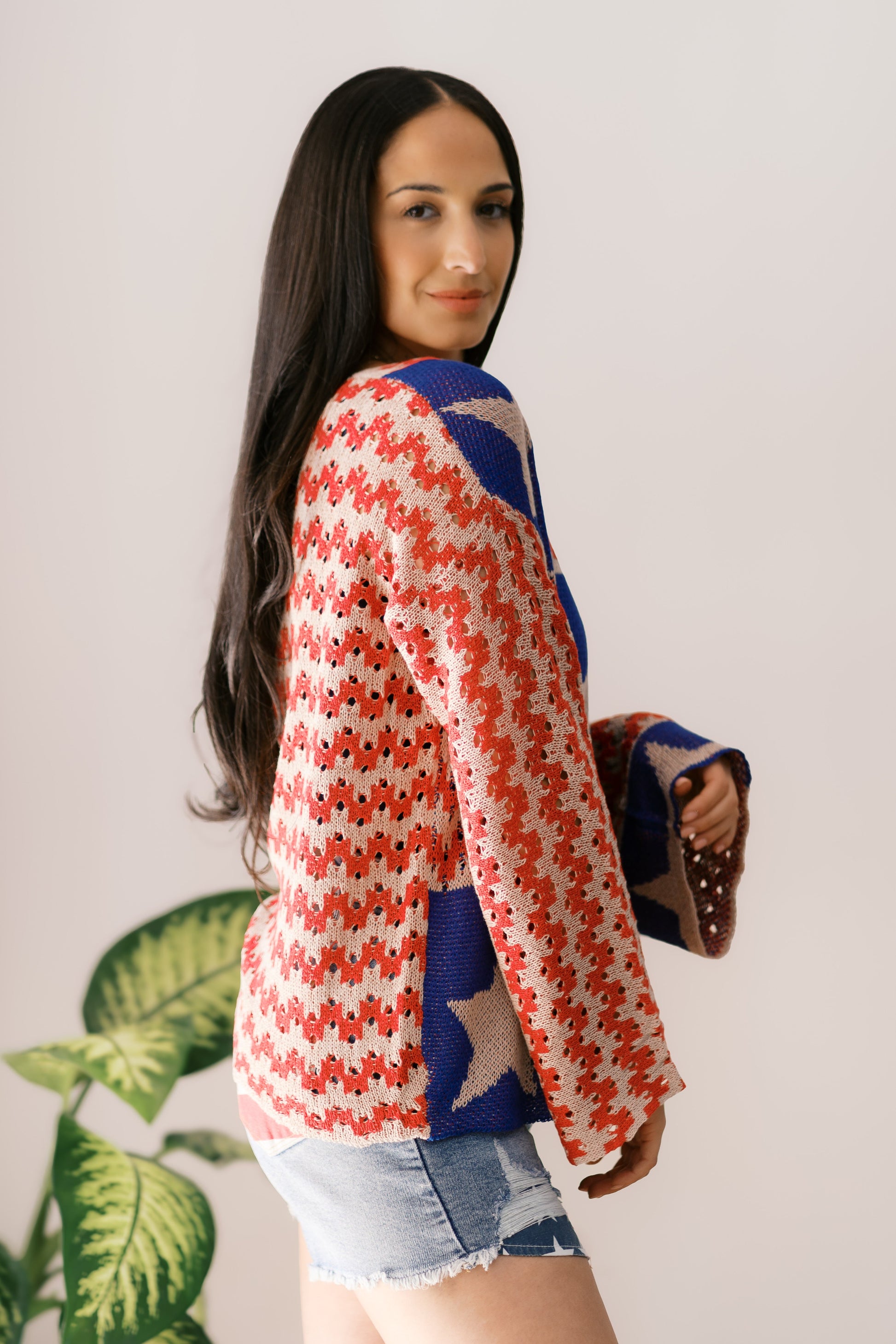 Get cozy in style with the American Dream Cardigan. This lightweight open sweater features a playful American flag pattern, perfect for showing off your patriotic spirit. Stay stylish and comfortable all day long. (USA! USA!)