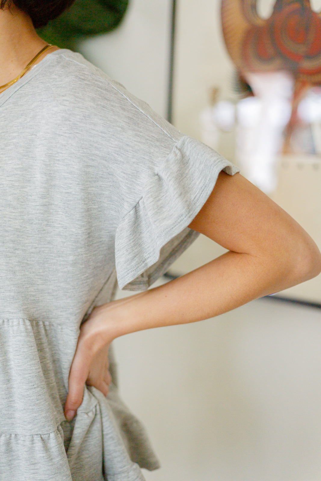 Keywords: Babydoll, Ruffle, Peplum, Gray, Short Sleeve