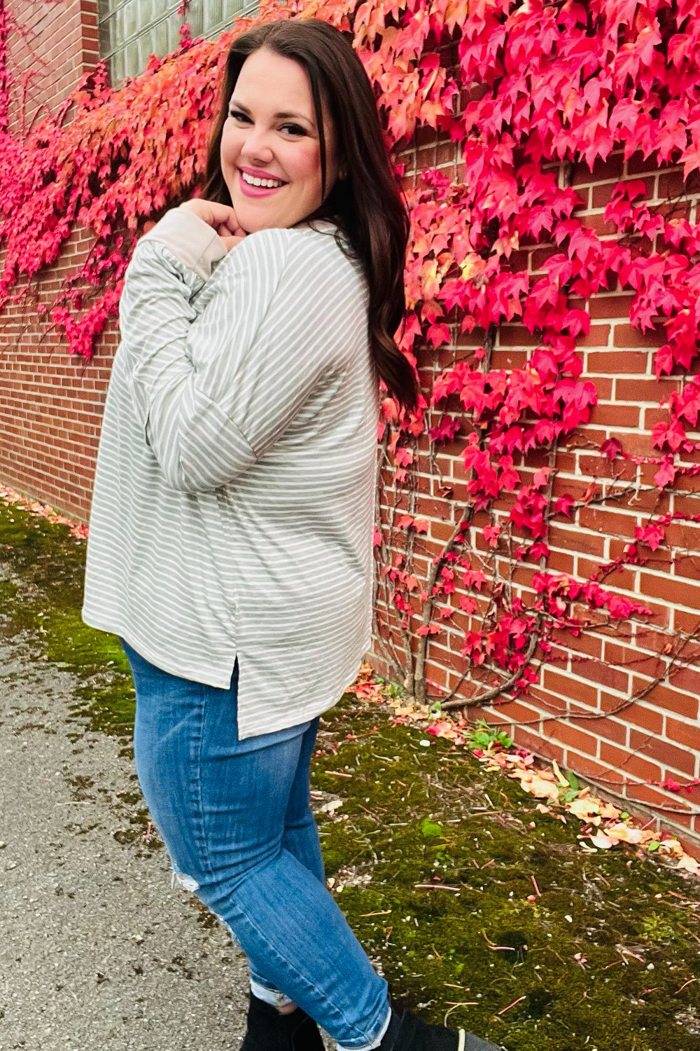This ivory & grey color block striped round neck oversized top with soft knit will soon be your go-to casual piece for everyday wear. With long sleeves, bubble sleeves and outseam stitch details, wear for a comfy but stylish look.