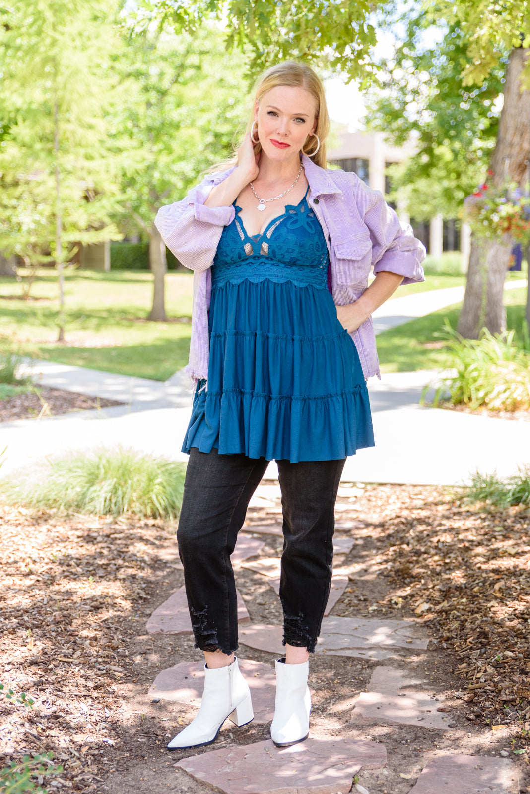 A whole new way to wear your favorite bralette! The Magic Touch Tank In Teal is the most romantic little top, with its sheer machine lace bodice, lined triangle cups, and high-low silhouette. Such a flowy, lightweight top perfect for those hot summer days! Pair with white jeans, and nude sandals for a complete look!