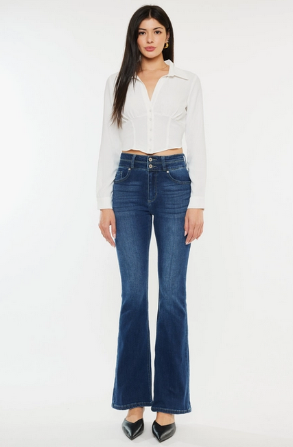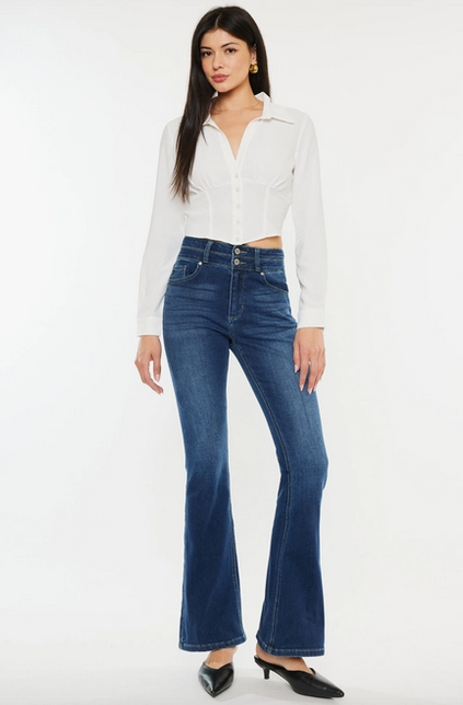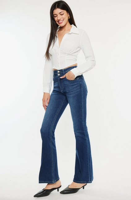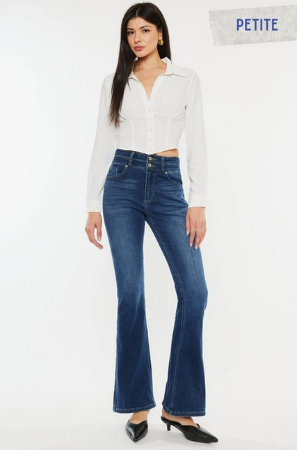 PETITE HIGH RISE SKINNY BOOTCUT MEDIUM WASH SUPER STRETCH 5 POCKET STYLE DOUBLE WAIST BAND DOUBLE BUTTON W/ ZIPPER CLOSURE