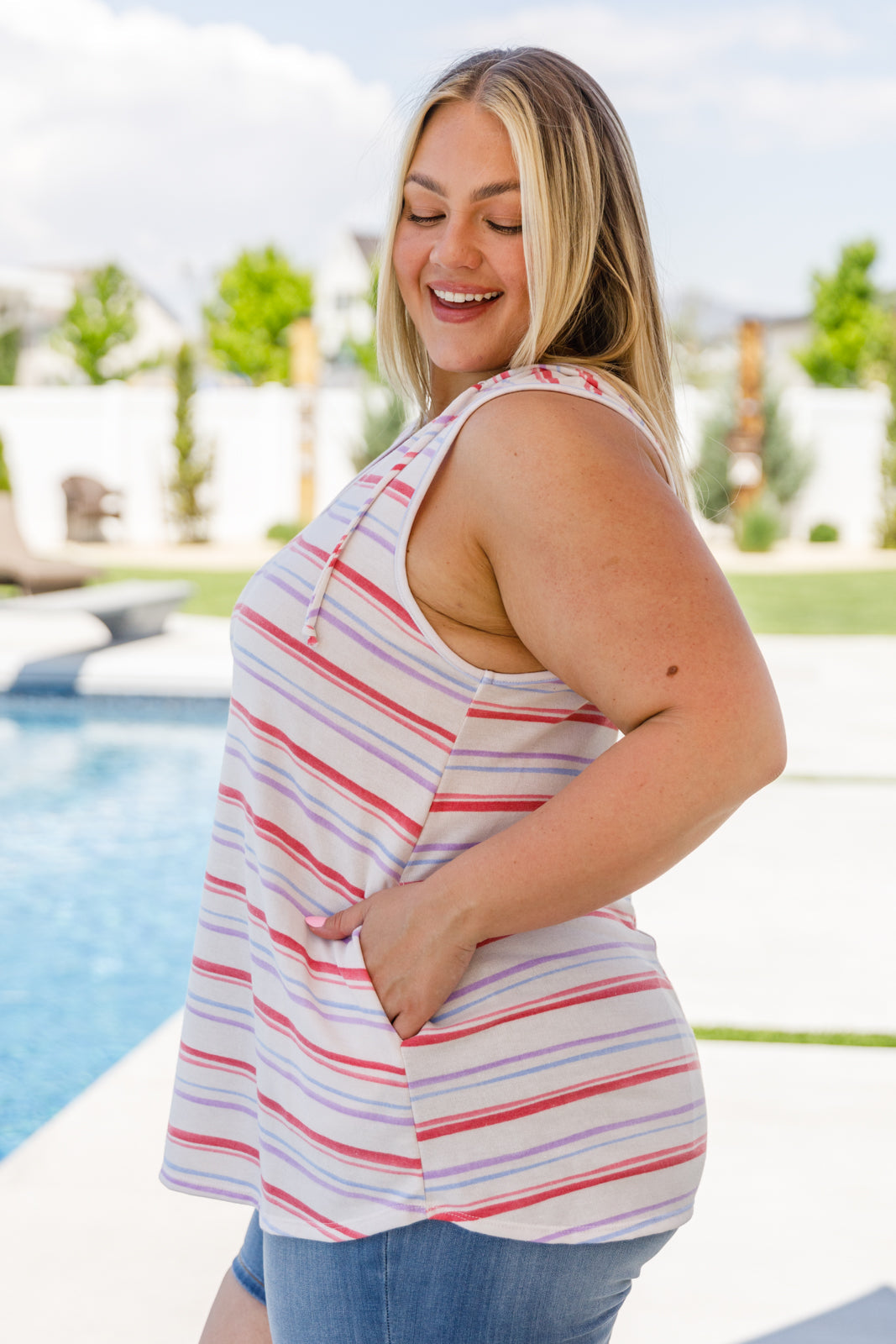 We are so excited to style our new Take A Day Off Hooded Tank! While it has endless styling options, we're pairing it with our bikini and denim cutoffs and heading to the pool! Featuring a notched neckline with faux drawstrings, stretchy soft fabric, and a fun hood in the back! With a sleeveless cut and flowy silhouette this makes for the perfect throw-on piece.